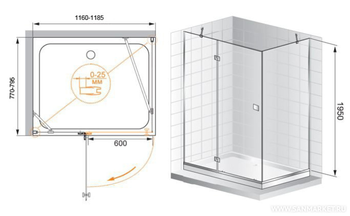 Обратите внимание, данная модель имеет регулируемый профиль,(116-118,5)х(77-79,5)х195 см, который позволит идеальноподогнать изделие под размеры в вашей ванной.