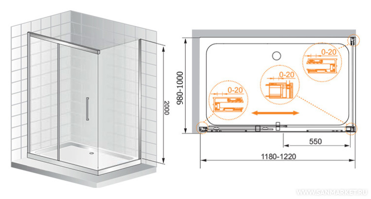 Обратите внимание, данная модель имеет регулируемый профиль,(118-122)x(98-100)x200 см, который позволит идеальноподогнать изделие под размеры в вашей ванной.