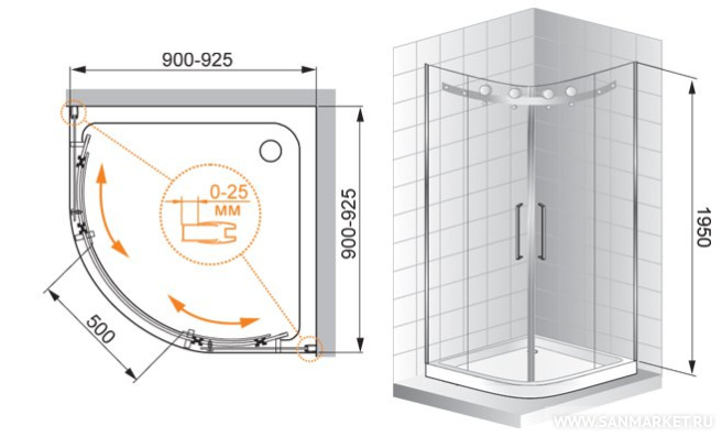 Обратите внимание, данная модель имеет регулируемый профиль,(89,5-92)x(89,5-92)х195 см, который позволит идеальноподогнать изделие под размеры в вашей ванной.