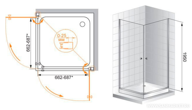 Обратите внимание, данная модель имеет регулируемый профиль,(66.2-68.7)x(66.2-68.7)x197 см, который позволит идеально подогнатьизделие под размеры в вашей ванной.