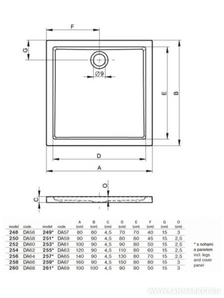 Поддон для душа Riho 248 80x80 DA5600500000000 выполнен из высококачественного акрила и имеет классическую квадратную форму. Диаметр сливного отверстия - 90 мм.