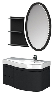 Подвесной набор мебели для ванной комнаты в стиле модерн подойдет тем, кто предпочитает современный стиль в интерьере. Обтекаемые формы, лаконичные цвета, оригинальная деталь — ручки в виде прорезей в фасадах, все это выделяет гарнитур Опера, делает его стилистическим центром ванной комнаты. Раковина-столешница из литьевого мрамора повторяет плавные линии тумбы, широкое крыло позволяет с удобством разместить большое количество гигиенических средств и принадлежностей. Комплект имеет как правосторонний, так и левосторонний вариант расположения. Большое овальное зеркало оборудовано встроенное подсветкой. Настенная панель со стеклянными полками дополняет и уравновешивает композицию, а также создает дополнительные места для хранения самых необходимых мелочей.