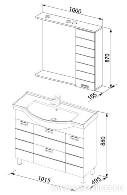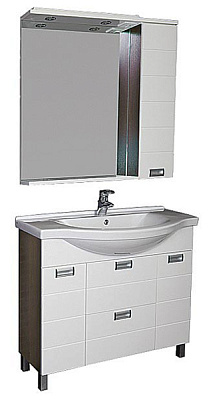 Стильный гарнитур для ванной комнаты отличается внушительными размерами и оригинальным внешним видом. Отделка фасадов, благодаря обилию горизонтальных линий, придает комплекту устойчивость и основательность. Необычные ручки привлекают внимание и подчеркивают простоту и лаконичность дизайна. Раковина-столешница округлой формы, поставляемая в комплекте, выступает вперед, что обеспечивает дополнительный комфорт при умывании. Зона хранения в тумбе представлена двумя широкими ящиками и отделением с распашной дверцей. Боковой шкафчик навесного зеркала позволит всегда иметь под рукой необходимые гигиенические и косметические средства.