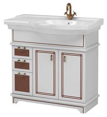 Нейтральные цвета и натуральные оттенки деревасоздают элегантный, сдержанный образ тумбы Луис. Необычный декор,подчеркивающий геометрическую стройность и правильность композиции,отражает вдохновение дизайнера — античность с ее идеальнымипропорциями стала прообразом для создания этого современногоосмысления классики. Плавные линии резных отделочных элементовсмягчают строгость дизайна, делают его более легким иторжественным. Для хранения банных принадлежностей в тумбепредусмотрено два больших отделения с распашными дверцами итри компактных ящика.