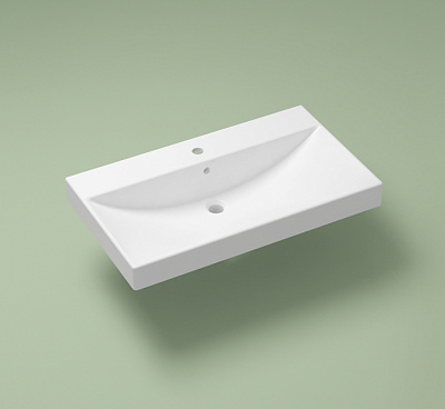 Нижняя часть умывальника находится под столешницей, а видимой остается только внутренняя часть раковины, смеситель и донный клапан (не входят в базовую комплектацию). Умывальник отлично сочетается с различными материалами от дерева до мрамора, а также со смесителем стандартной высоты около 100 мм.