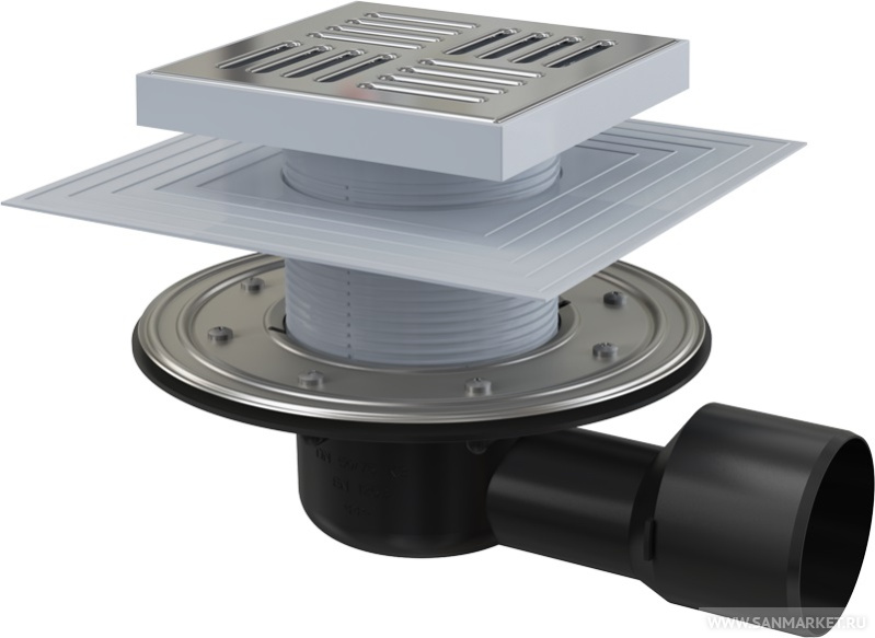 Сливной трап 105 × 105/50/75, подводка – прямая, решетка – нержавеющая сталь, фланец –нержавеющая сталь, воротник – 2–х уровневая изоляция, гидрозатвор – сухой и мокрый