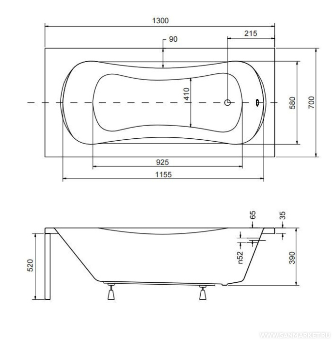 Прямоугольная акриловая ванна с плавными линиями украсит любую ванную комнату.