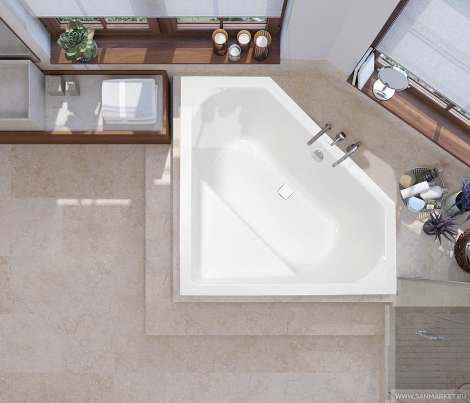 Cavallo corner 140x140 Vagnerplast – интересное дизайнерское решение для обустройства современной ванной комнаты. Ванна выполнена в угловой форме, но поверхность самой купели, без учёта углового пространства, вписана в скруглённый прямоугольник – оптимальный вариант для комфортных водных процедур. В угол ориентирована площадка, которую можно использовать как столик, полку или сиденье. При сравнительно небольших габаритах ванна объёмиста и вмещает 244 литра воды.