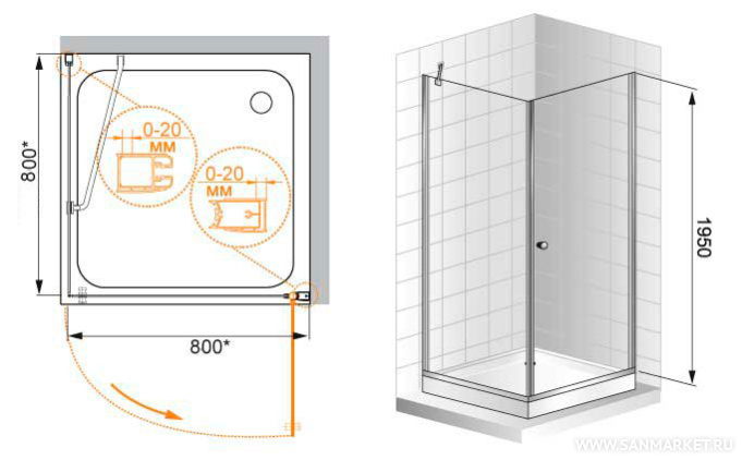 Обратите внимание, данная модель имеет регулируемый профиль,(78-80)x(78-80)x195 см, который позволит идеально подогнать изделиепод размеры в вашей ванной.