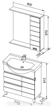 Набор мебели для ванной комнаты Доминика в стиле модерн отличается необычным дизайном. Оригинальные детали — ручки-прорези, подсветка LED, ритм, создаваемый горизонтальными элементами отделки — подчеркивают неординарность, экзотичность гарнитура. Функциональная часть представлена двумя вместительными ящика и отделением с распашной дверцей в напольной тумбе, а также компактным боковым шкафчиком для гигиенических и косметических средств. В комплекте поставляется раковина-столешница из санфаянса. Дополнительно приобретается высокий пенал с большими секциями, с дверцами и двумя открытыми полочками.