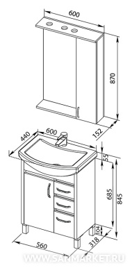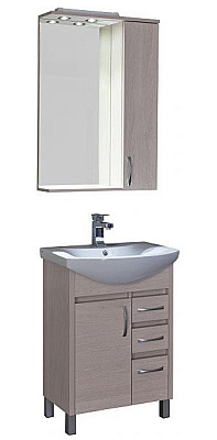 Мебельный гарнитур для ванной комнаты Донна включает тот необходимый минимум, без которого трудно обойтись в повседневном быту. Напольная тумба с раковиной-столешницей и двумя отделениями с распашными дверцами позволит с удобством разместить необходимые бытовые средства и банные принадлежности. Навесное зеркало оборудовано встроенной подсветкой, а также выключателем и розеткой для бытовых приборов. Боковой шкафчик с компактными полками предназначен для мелочей, которые всегда должны быть под рукой.