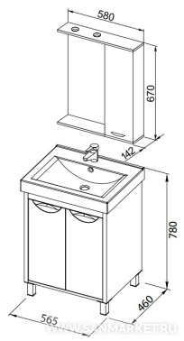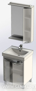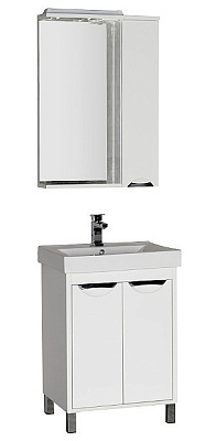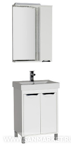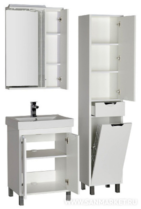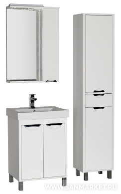 Компактный гарнитур для малогабаритных ванных комнат отлично впишется в современный интерьер любой цветовой гаммы. Аккуратный умывальник покрывает всю поверхность тумбы, тем самым используя все возможное пространство с максимальной пользой. Зеркало оснащено навесной полкой, где можно разместить часто используемые гигиенические принадлежности. Верхняя подсветка избавит от необходимости тратиться на дополнительное освещение. Тумба оборудована шкафчиком с двумя распашными дверцами, в котором достаточно места для большого количества косметических средств, полотенеци прочих предметов гигиены. Вы также можете приобрести высокий напольный пенал с двумя большими отделениями и небольшим ящиком.