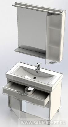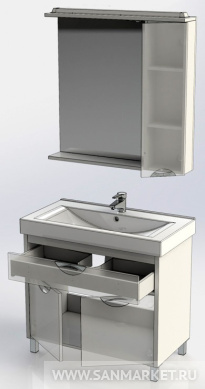 Функциональный комплект для ванной комнаты Гретта впишется в экстравагантный и модный интерьер. Это эффектный гарнитур в стиле модерн. Оригинальные ручки ящиков и шкафов придают комплекту причудливый ретро-футуристический вид. Оптимальное сочетание зон для хранения — здесь есть широкий ящик, вместительный шкаф с двумя распашными дверцами и аккуратные полочки рядом с зеркалом; все это обеспечивает достаточно места для расположения всего необходимого. Вы можете дополнить комплект высоким пеналом в том же стиле.