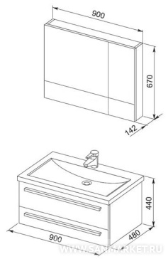 Функциональный гарнитур в стиле модерн станет отличается продуманным дизайном. Благодаря простым формам и строгому внешнему виду, этот комплект будет хорошо смотреться в любом интерьере. Нейтральный цвет гарнитура оставляет свободу выбора оттенков и паттернов в отделке — комплект можно сочетать с любыми, даже самыми креативными идеями. Тумба состоит из двух частей — навесной модуль с двумя вместительными ящиками и подвижная часть, являющаяся одновременно местом для хранения и широкой площадкой, которая может использоваться как подставка или даже сиденье. Позади зеркала скрывается компактный шкафчик, где будет удобно хранить гигиенические средства.