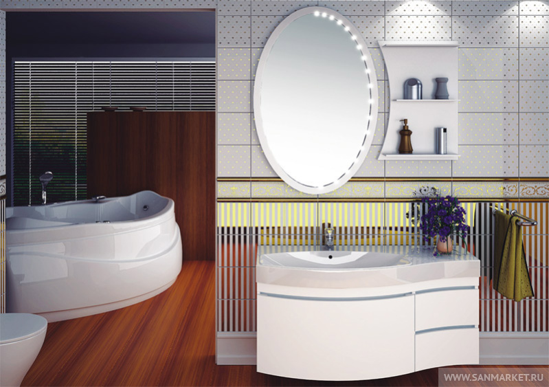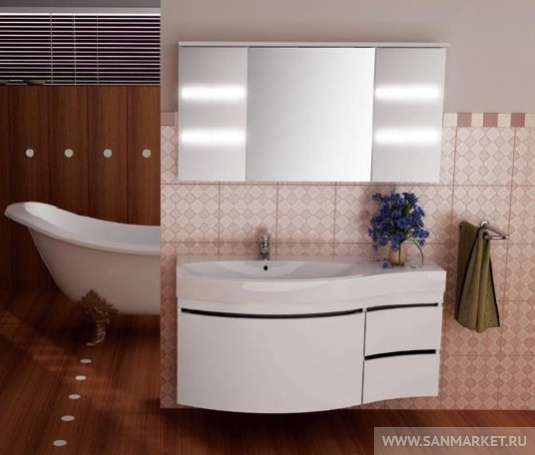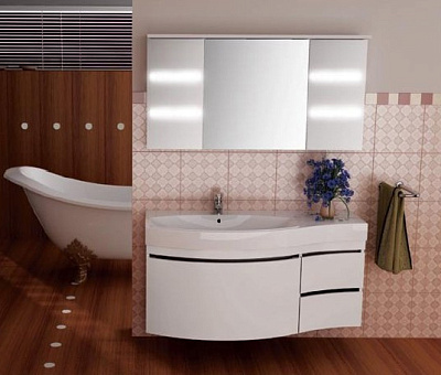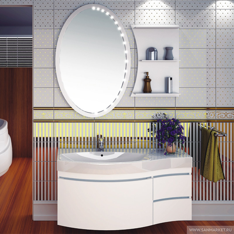 Подвесной набор мебели для ванной комнаты в стиле модерн подойдет тем, кто предпочитает современный стиль в интерьере. Обтекаемые формы, лаконичные цвета, оригинальная деталь — ручки в виде прорезей в фасадах, все это выделяет гарнитур Опера, делает его стилистическим центром ванной комнаты. Раковина-столешница из литьевого мрамора повторяет плавные линии тумбы, широкое крыло позволяет с удобством разместить большое количество гигиенических средств и принадлежностей. Комплект имеет как правосторонний, так и левосторонний вариант расположения. Большое овальное зеркало оборудовано встроенное подсветкой. Настенная панель со стеклянными полками дополняет и уравновешивает композицию, а также создает дополнительные места для хранения самых необходимых мелочей.