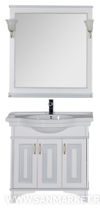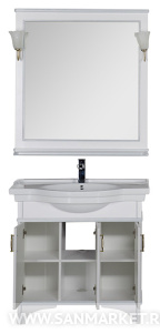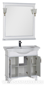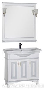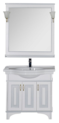Белое в сочетании с серебром выглядит очень нежно и свежо. Сериямебели «Валенса» российской торговой марки Aquanet выполнена в томчисле и в таком цветовом варианте, причем оттенок серебра нанесен сприменением эффекта «кракле», т.е. потрескавшейся краски. Тумба подраковину имеет 3 распашные дверцы, в комплект входит также зеркало,которое при желании можно снабдить двумя светильниками.
