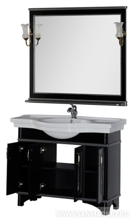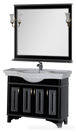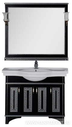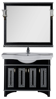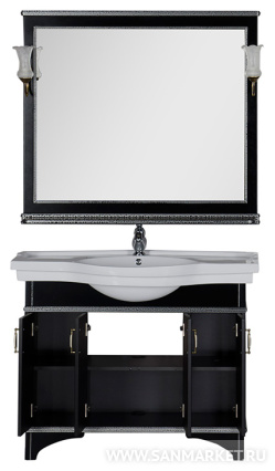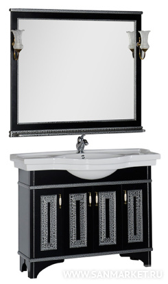 Сочетание черного цвета и серебра – это беспроигрышнаяклассика, но применительно к мебели для ванной комнаты его можноназвать и экстравагантным. Серия мебели «Валенса» российскойторговой марки Aquanet выполнена в том числе и в таком цветовомварианте, причем оттенок серебра нанесен с применением эффекта«кракле», т.е. потрескавшейся краски. Тумба под раковину имеет 4распашные дверцы, в комплект входит также зеркало, которое прижелании можно снабдить двумя светильниками.
