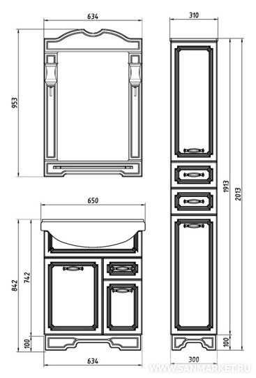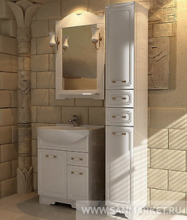 Серия выполнена в классическом стиле. Особыйшарм и привлекательность набору придает декоративная резьба надверцах. Оригинально выполненные ручки с керамическими вставкамипридают комплекту утонченность. Дизайн мебели сочетается сфункциональностью - множество выдвижных ящиков, удобная раковина(глубокая чаша расположена в центре, и значит, образуетсядополнительное место по бокам).
