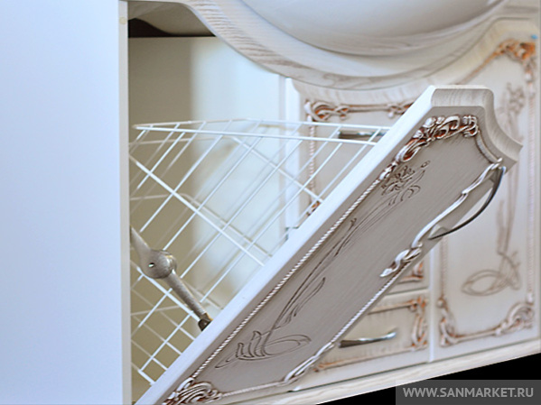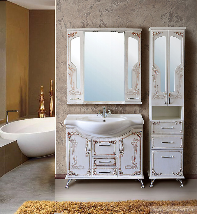 Комплект ванной мебели «Барселона», выполненный с применением технологии патинирования, сочетает в себе помпезность и современность, благородство и элегантность. Мягкие изгибы модели, приятное цветовое сочетание, легкий чувственный орнамент привносят естественность и изысканность в интерьер, а встроеная корзина для белья, удобные ящички, множество отделов и встроенная подсветка зеркала делают эту модель очень удобной в использовании.