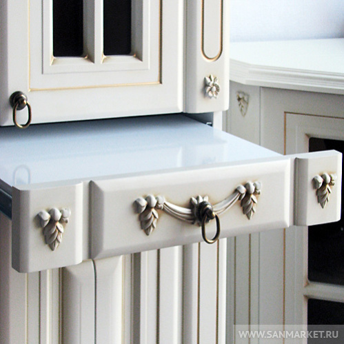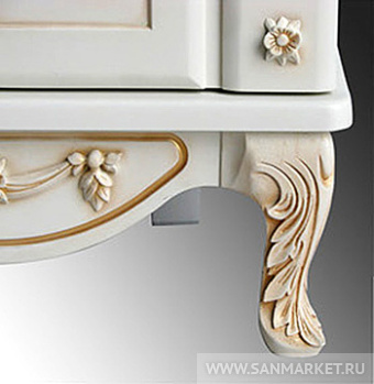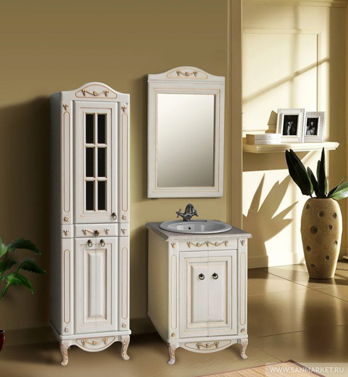 Традиционно в интерьере ванной комнаты преобладают светлые оттенки, и в комплекте Верона dorato компания Атолл решила не отходить от общепринятых правил. Рама зеркала, тумба под умывальник и пенал окрашены в белый цвет с легким сливочным оттенком. Декоративные элементы и легкая фрезеровка фасадов подчеркнуты золотой патиной, что делает атмосферу в ванной комнате более нежной и теплой. Мебельные ножки, ручки и тонированные стекла вписываются в цветовую гамму изделия, подчеркивают изящность и нарядность классического стиля. Все элементы серии Верона выполнены из влагостойких материалов, поэтому мебель не только будет радовать глаз, но и служить долгие годы.