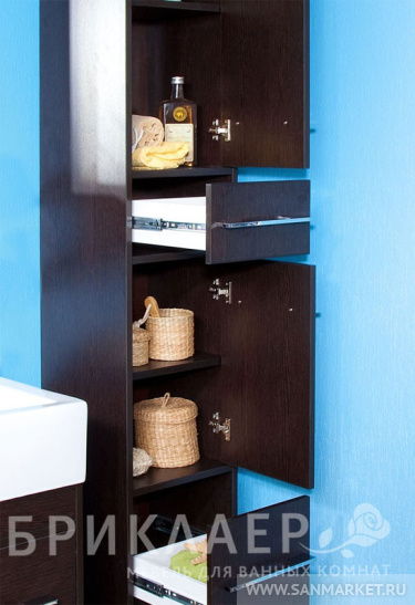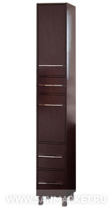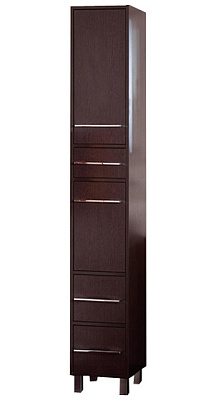 Вся мебель из коллекции Чили имеет металлические хромированные ручки и металлические ножки. Компактные размеры шкафа-пенала, позволяют ему разместиться в помещении даже небольшой ванной комнаты. Пенал Чили имеет пять отделений. Верхняя ниша, в которой съемная полка закрывается дверцей. Далее располагается выдвижной узкий ящик. Средняя секция, в которой съемная полка закрывается дверцей. Внизу располагается два выдвижных высоких ящика.