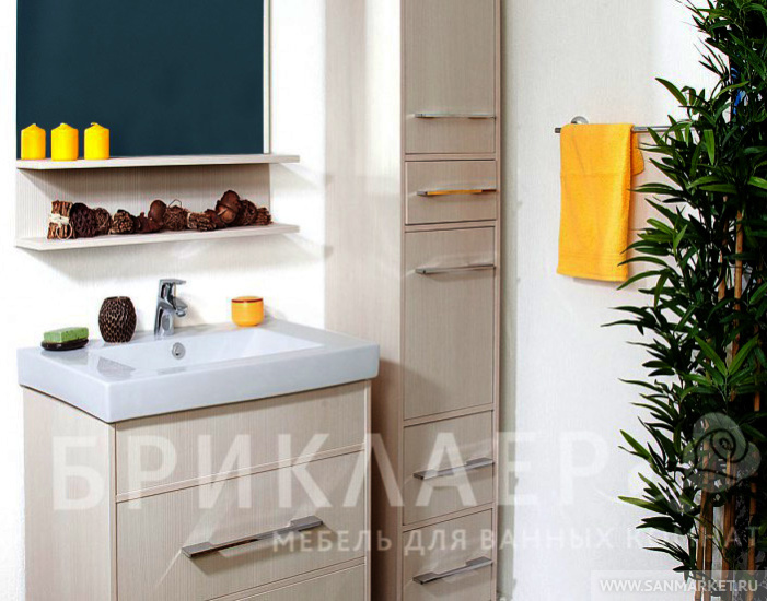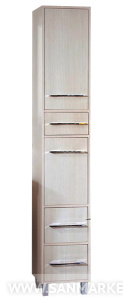 Вся мебель из коллекции Чили имеет металлические хромированные ручки и металлические ножки. Компактные размеры шкафа-пенала, позволяют ему разместиться в помещении даже небольшой ванной комнаты. Пенал Чили имеет пять отделений. Верхняя ниша, в которой съемная полка закрывается дверцей. Далее располагается выдвижной узкий ящик. Средняя секция, в которой съемная полка закрывается дверцей. Внизу располагается два выдвижных высоких ящика.