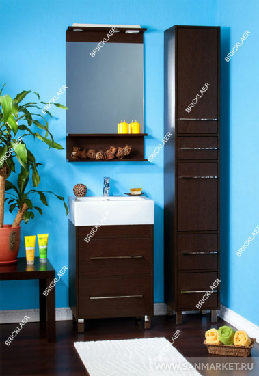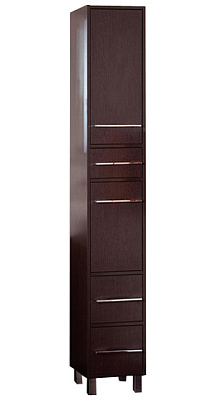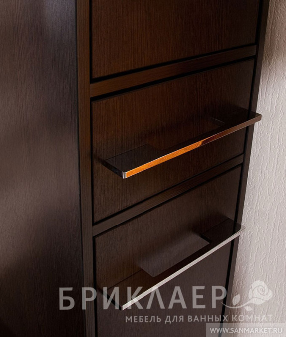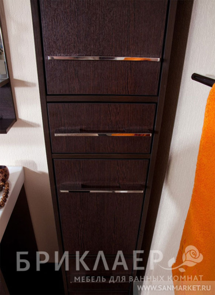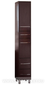 Вся мебель из коллекции Чили имеет металлические хромированные ручки и металлические ножки. Компактные размеры шкафа-пенала, позволяют ему разместиться в помещении даже небольшой ванной комнаты. Пенал Чили имеет пять отделений. Верхняя ниша, в которой съемная полка закрывается дверцей. Далее располагается выдвижной узкий ящик. Средняя секция, в которой съемная полка закрывается дверцей. Внизу располагается два выдвижных высоких ящика.