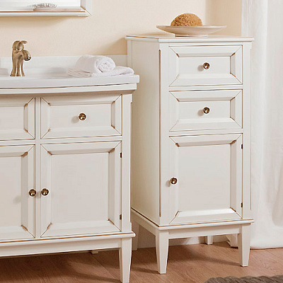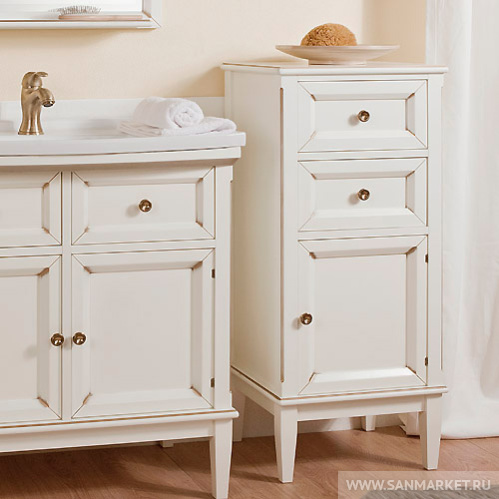 Коллекция мебели для ванной комнаты Джардин - это очень удачная попытка воссоздать стиль «Прованс» в любом доме. Для этого стиля присущи деревенские черты, натуральные материалы и светлые пастельные тона. Для придания подлинности ощущений, мебель стиля «Прованс» искусственно состаривают: наносят потертости, сколы, древоточины, проеденные жучком. BIANCO Light Vintage (арт. B-003) - тонировка белая с легким патинированием. Для придания эффекта старины используется завальцовка углов и протирка граней до дерева. Цвет патины - орех. Финишный блеск "шелковисто матовый".