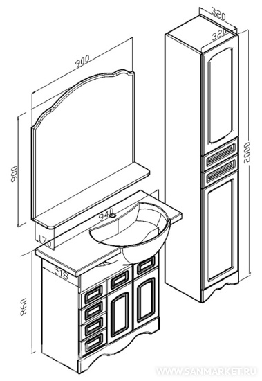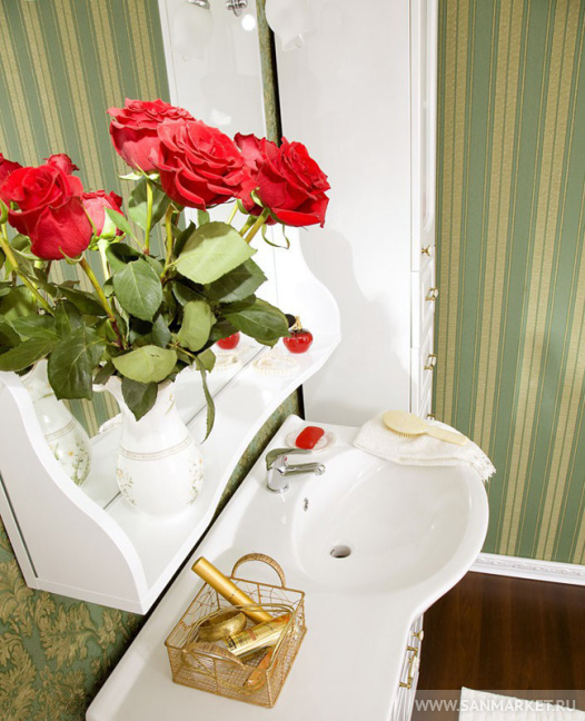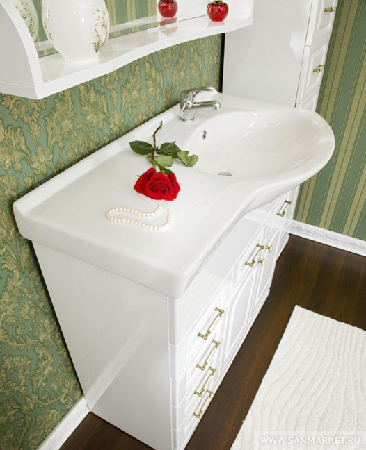 Тумба с раковиной очень вместительна. Белая раковина имеет удобную форму, что позволит поставить на нее косметические средства.