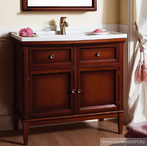 Тонировка - "орех". Для придания эффекта старины используется завальцовка углов и многослойное патинирование. Цвет патины - орех, "плесень". Затемнение углов, ножек. Финишный блеск "шелковисто глянцевый". Коллекция мебели для ванной комнаты Джардин - это очень удачная попытка воссоздать стиль «Прованс» в любом доме. Для этого стиля присущи деревенские черты, натуральные материалы и светлые пастельные тона. Для придания подлинности ощущений, мебель стиля «Прованс» искусственно состаривают: наносят потертости, сколы, древоточины, проеденные жучком.