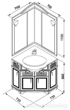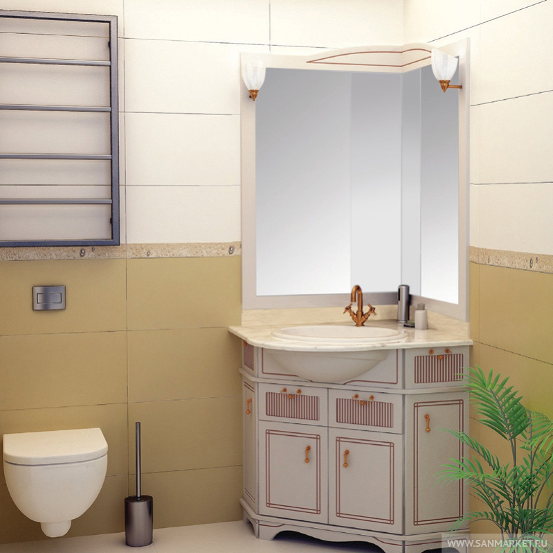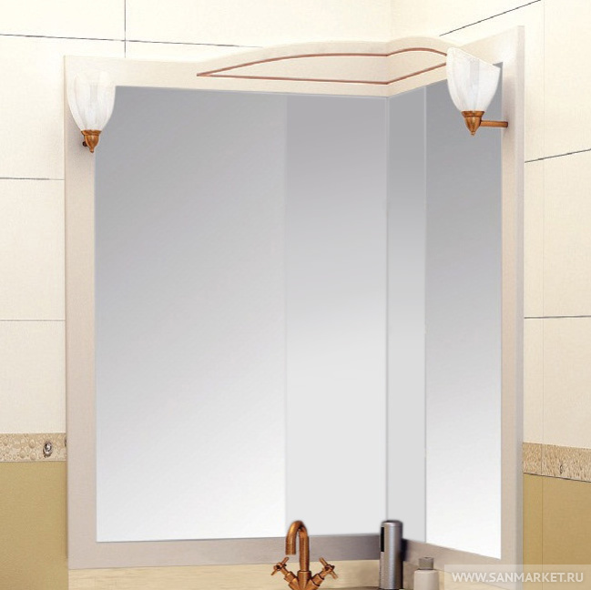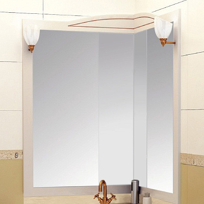 Угловое зеркало из комплекта мебели Луис выполнено в том же стиле, что и весь набор. Благодаря угловому расположению такая модель помогает экономить пространство и эффективно использовать традиционно плохо задействованные зоны. В угловой части модели расположены компактные полки, на которых можно с удобством разместить все необходимые гигиенические средства, которые всегда должны быть под рукой.