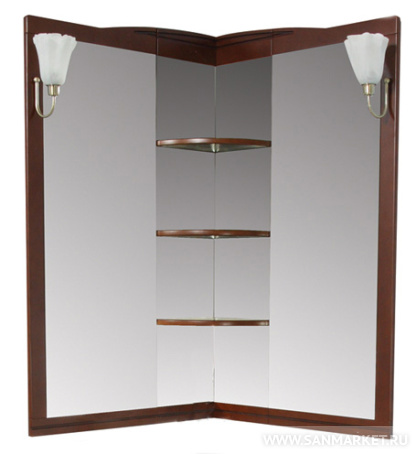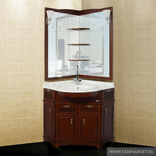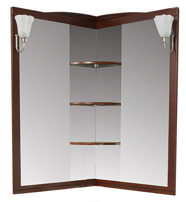 Угловое зеркало из комплекта мебели Луис выполнено в том же стиле, что и весь набор. Благодаря угловому расположению такая модель помогает экономить пространство и эффективно использовать традиционно плохо задействованные зоны. В угловой части модели расположены компактные полки, на которых можно с удобством разместить все необходимые гигиенические средства, которые всегда должны быть под рукой.