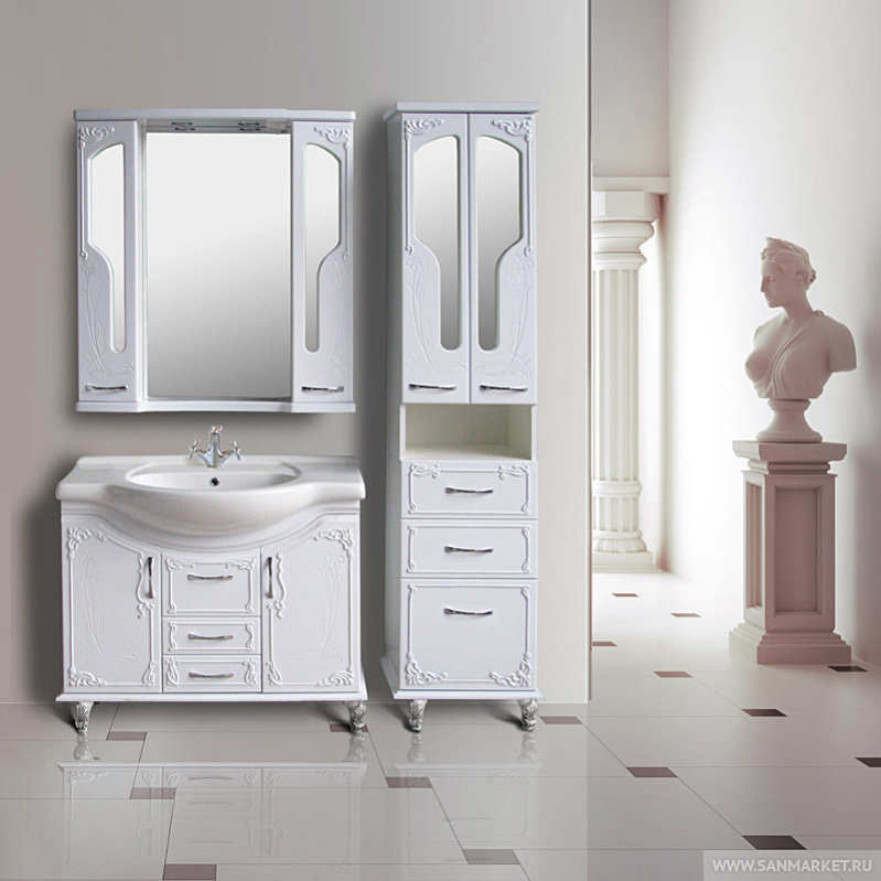 Комплект ванной мебели «Барселона», выполненный с применением технологии патинирования, сочетает в себе помпезность и современность, благородство и элегантность. Мягкие изгибы модели, приятное цветовое сочетание, легкий чувственный орнамент привносят естественность и изысканность в интерьер, а встроеная корзина для белья, удобные ящички, множество отделов и встроенная подсветка зеркала делают эту модель очень удобной в использовании.