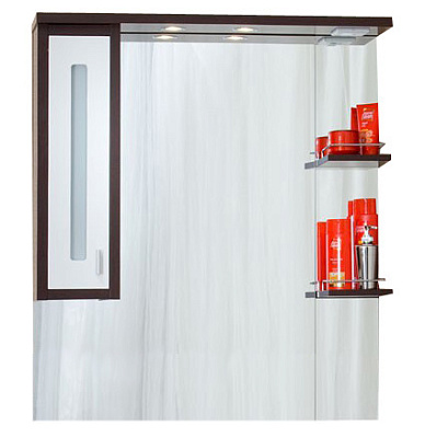 Внутри зеркального шкафчика располагаются две полочки. На верхней планке находятся два галогеновых врезных светильника.