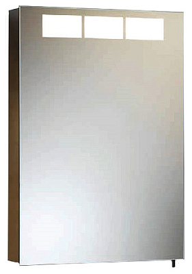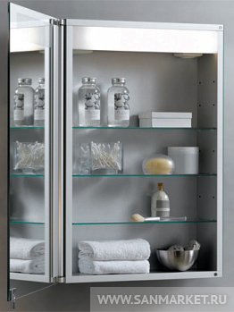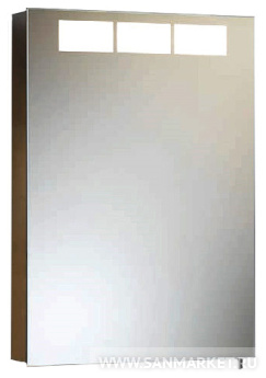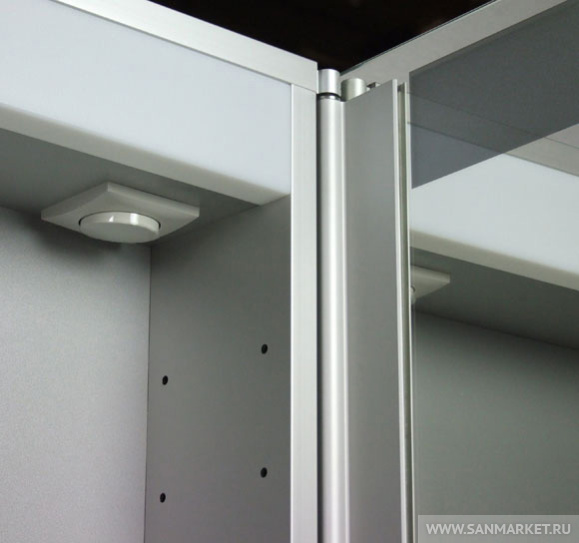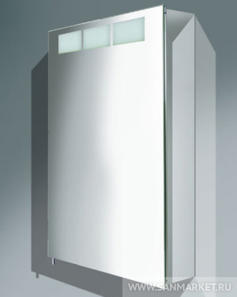 Распашная зеркальная дверца ROYAL T1 снабженаполупрозрачными прямоугольниками вдоль верхнего края – этоинновационное решение элегантно объединяет яркое внутреннееосвещение с мягким наружным. Корпус выполнен из стали с анодированнымпокрытием.