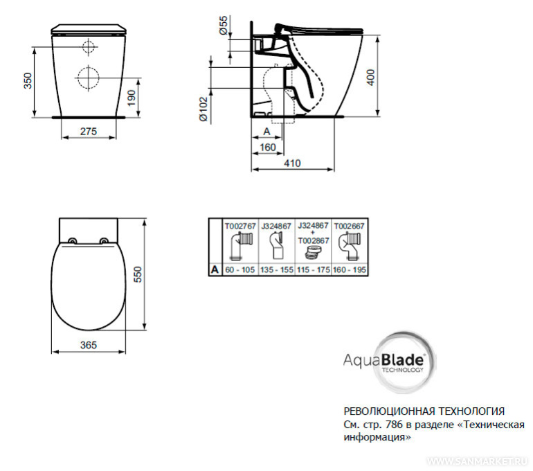 AquaBlade® Напольный пристенный унитаз-соло, горизонтальный выпуск, с крепежом TT0257919. Дополнительно заказывается сидение и крышка E712701 или E712801