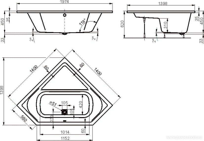 Cavallo corner 140x140 Vagnerplast – интересное дизайнерское решение для обустройства современной ванной комнаты. Ванна выполнена в угловой форме, но поверхность самой купели, без учёта углового пространства, вписана в скруглённый прямоугольник – оптимальный вариант для комфортных водных процедур. В угол ориентирована площадка, которую можно использовать как столик, полку или сиденье. При сравнительно небольших габаритах ванна объёмиста и вмещает 244 литра воды.