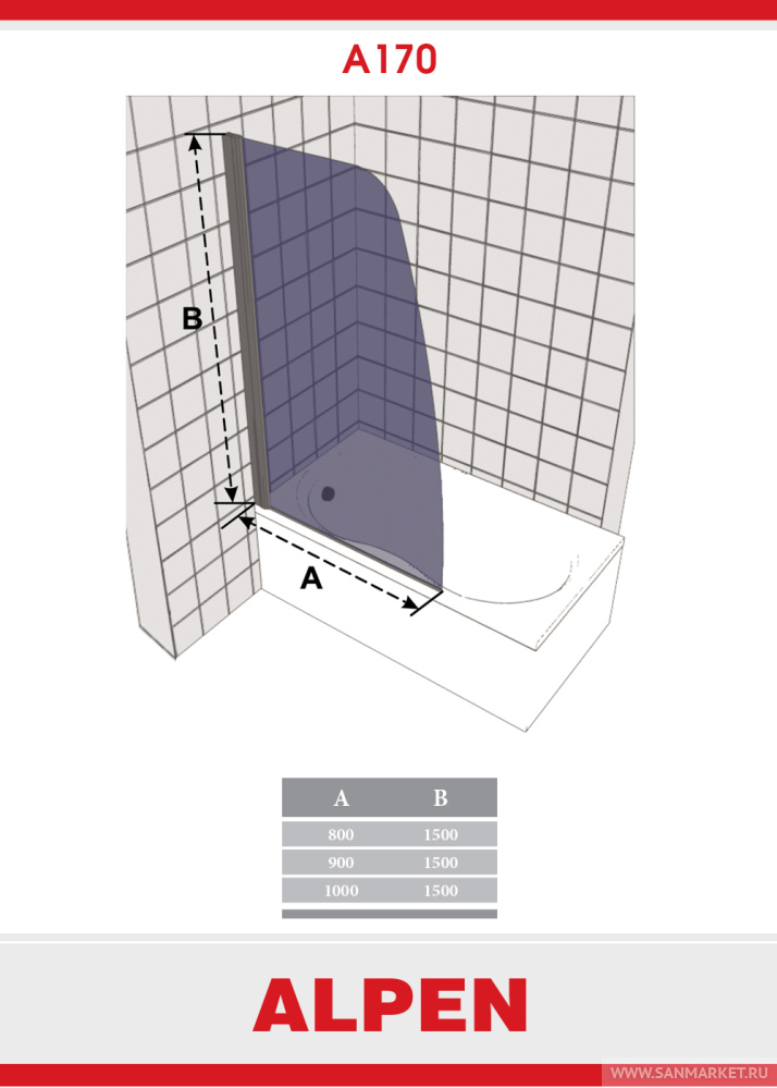 Душевая шторка ALPEN A170N-90 есть в наличии на наших складах. Вы можете купить модель Душевая шторка ALPEN A170N-90 от производителя с бесплатной доставкой при цене заказа от 25000 рублей. В интернет-магазине www.sanmarket.ru всегда низкие цены на Шторки на ванну бренда . У нас выгодные условия обмена товара и широкие возможности по безналичной оплате.