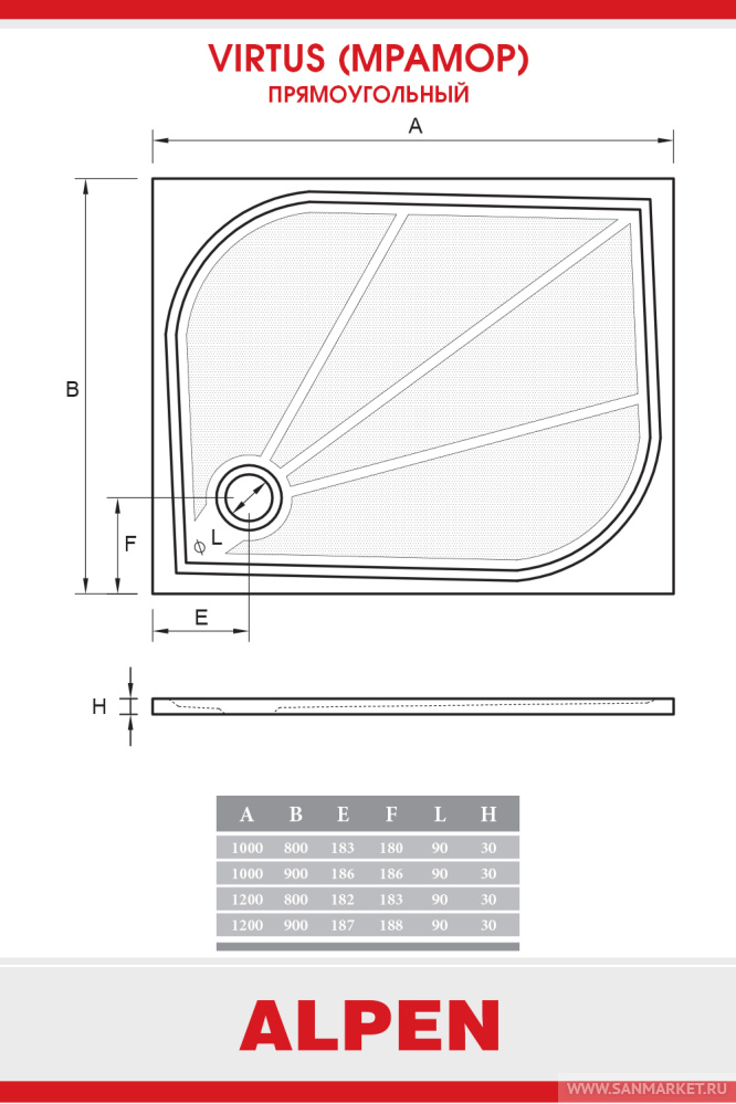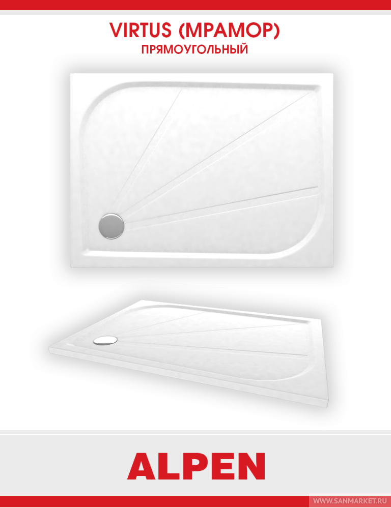 Поддон для душа ALPEN Virtus 90x70 есть в наличии на наших складах. Вы можете купить модель Поддон для душа ALPEN Virtus 90x70 от производителя с бесплатной доставкой при цене заказа от 25000 рублей. В интернет-магазине www.sanmarket.ru всегда низкие цены на Душевые поддоны бренда . У нас выгодные условия обмена товара и широкие возможности по безналичной оплате.
