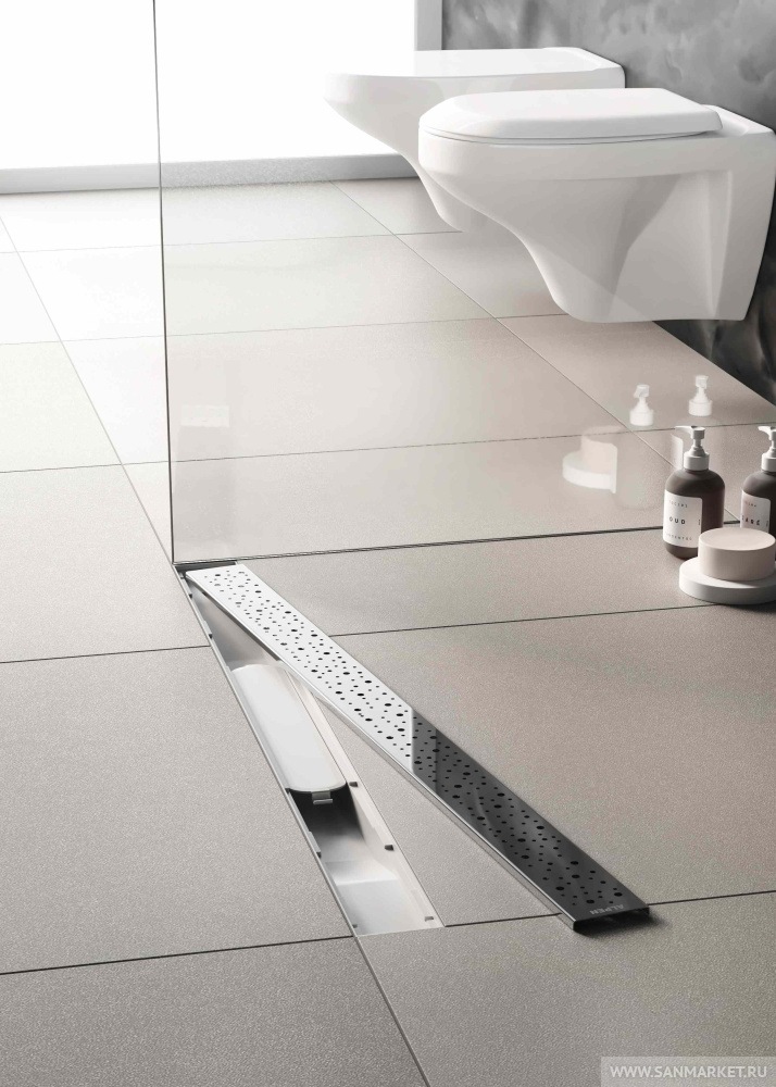 Водоотводящие желоба это атрибут для современного интерьера ванных комнат, сауны и зоны отдыха. Их преимуществом является простота установки, обслуживания и эксплуатация базбарьерной зоны. Монтаж можно производить как на открытых участках боксов и кабин, так и в близи стен. Нижняя часть изготовлена из ПП и ПС, решётка изготовлена из нержавеющей стали DIN 1.4301 K3 с возможной нагрузкой до 300 кг. Минимальная высота установки составляет 65 мм, желоб с регулировкой высоты.